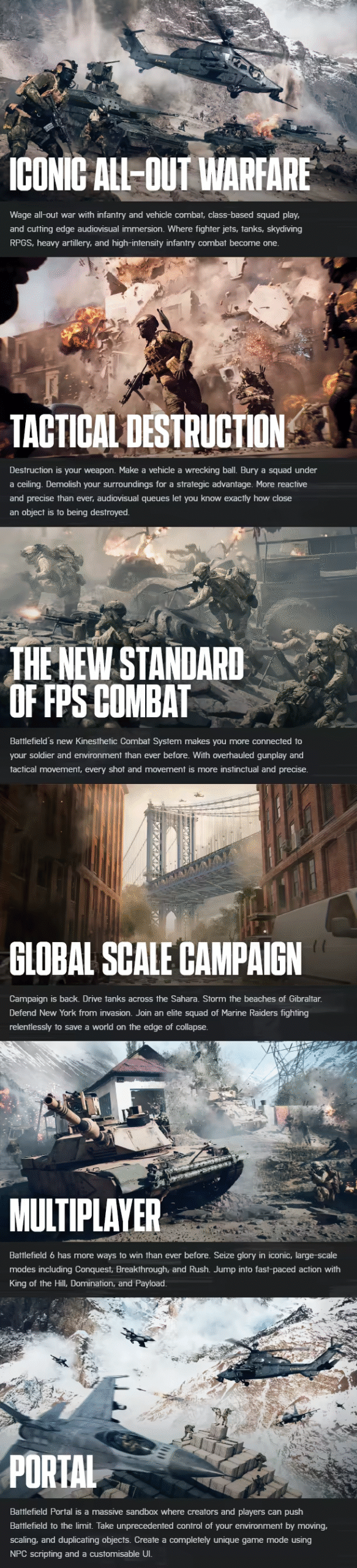 The ultimate all-out warfare experience. Fight in high-intensity infantry combat. Rip through the skies in aerial dogfights. Demolish your environment for a strategic advantage. Harness complete control over every action and movement using the Kinesthetic Combat System. In a war of tanks, fighter jets, and massive combat arsenals, the deadliest weapon is your squad. This is Battlefield 6.