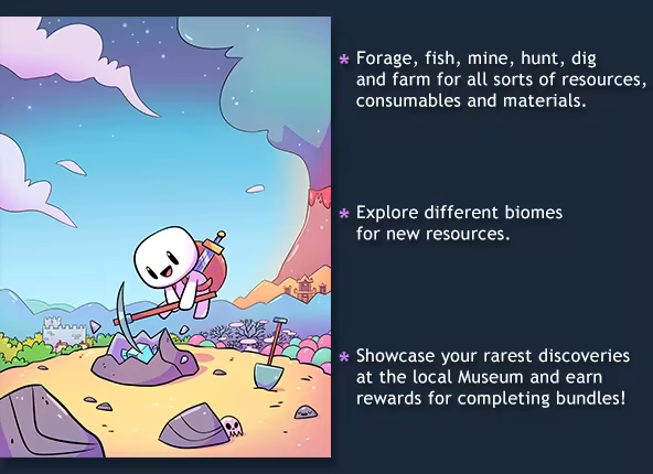 Forager is a 2D open world game inspired by exploration, farming and crafting games such as Stardew Valley, Terraria & Zelda.